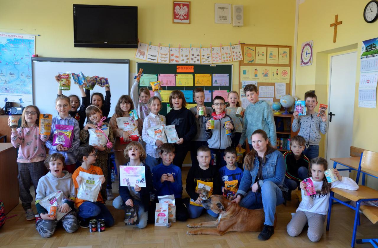 Cała klasa oraz Pani wychowawczyni mocno zaangażowana jest w pomoc bezdomnym zwierzętom. Dzieci wykazały się wyjątkową ciekawością podczas omawiania tematów związanych z opieką nad bezdomnymi zwierzętami.