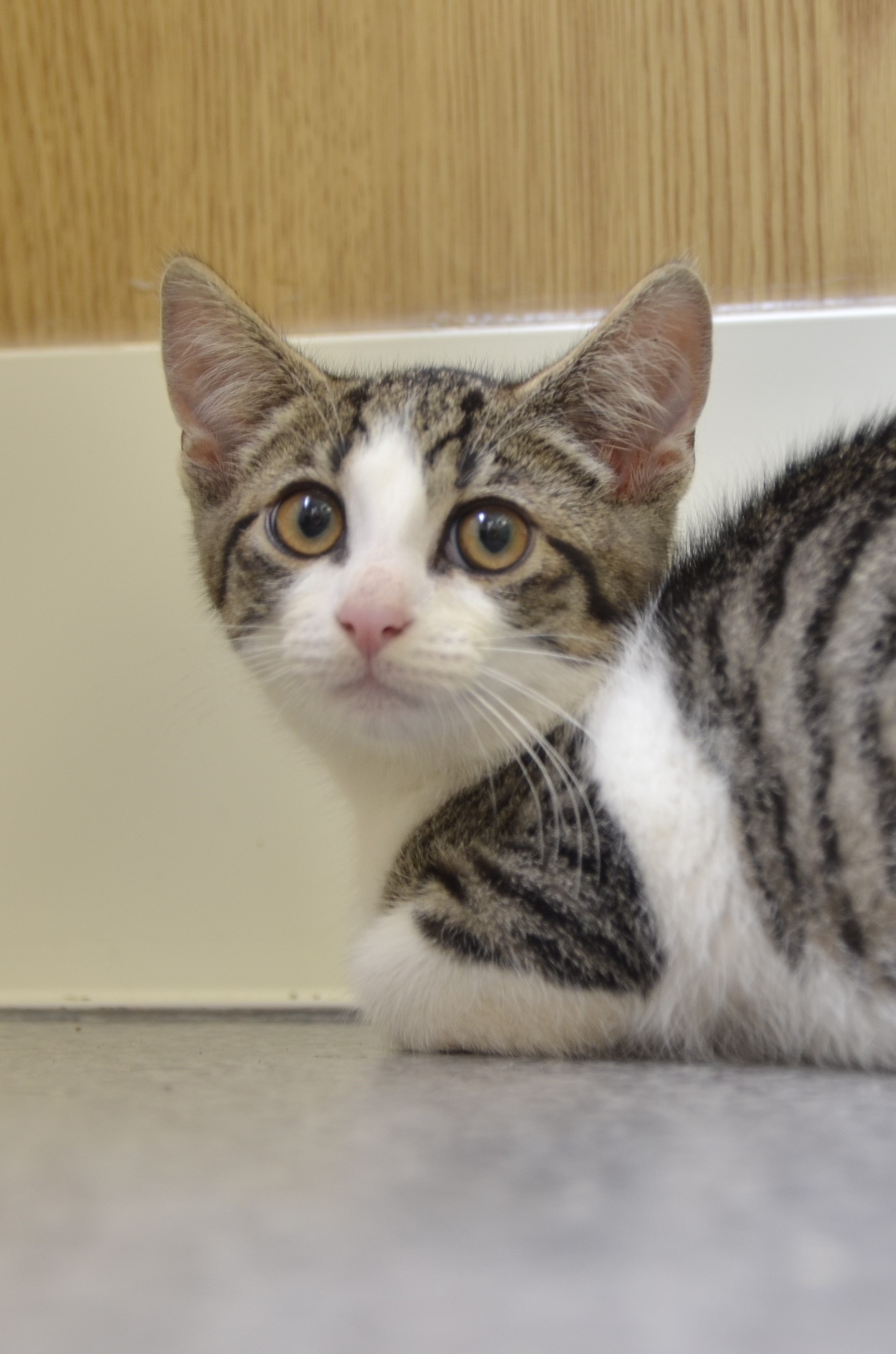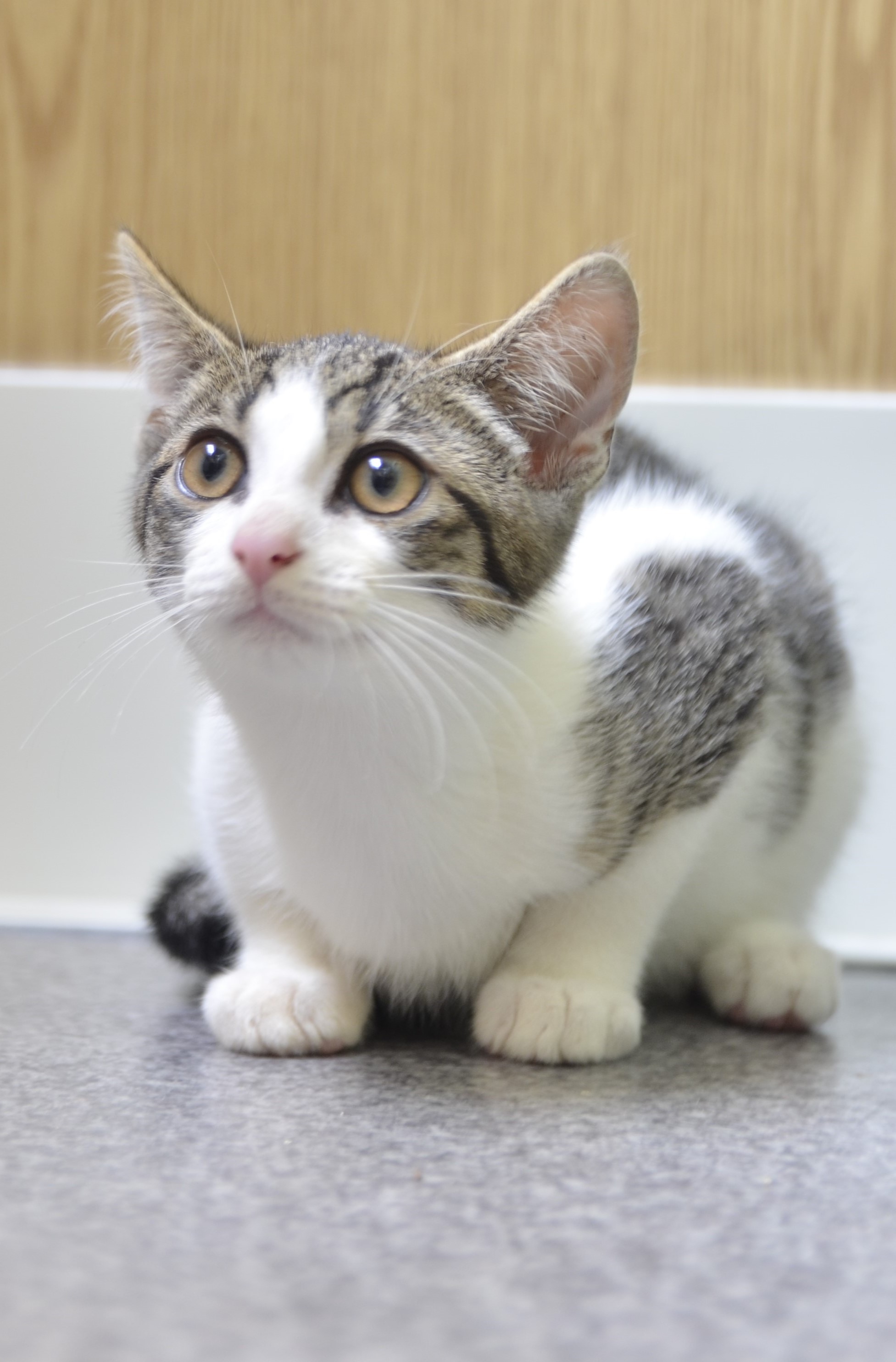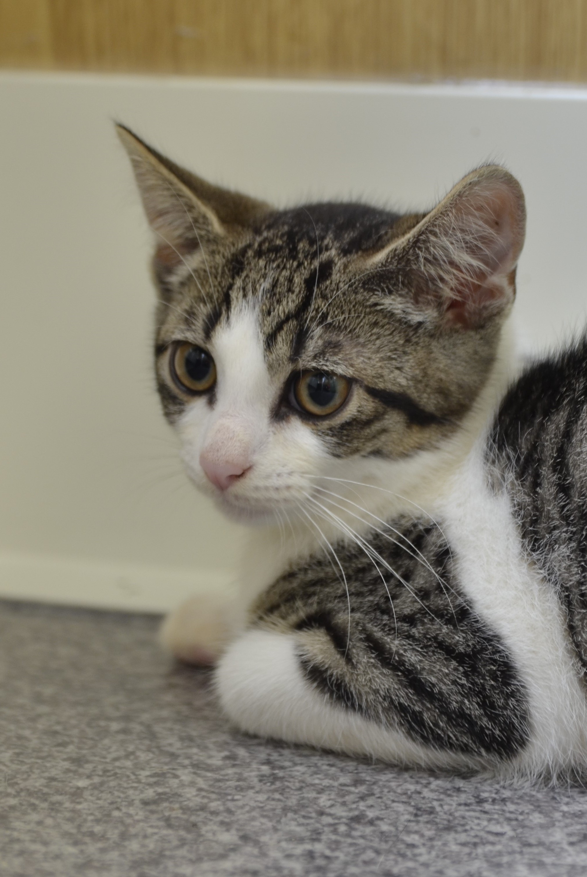 Młodziutki trochę nieśmiały kot, który z pewnością w domowych warunkach nabierze odwagi i znów będzie cieszył się z dzieciństwa.